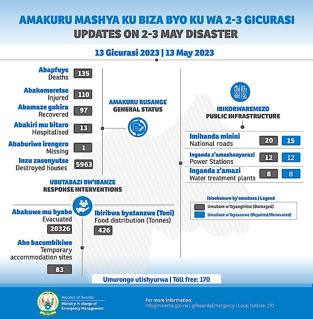 Minisiteri ishinzwe ibikorwa by’ubutabazi ikomeje gukorana n’inzego zose mu kugoboka abibasiwe n’ibiza. Dore imibare iheruka ku biza byo ku wa 2 - 3 Gicurasi.